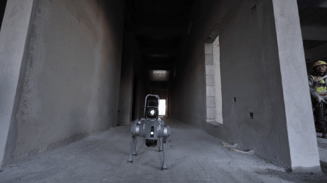 四足仿生结构+强化学习导航,可爬 30° 楼梯、跨越 20 cm 障碍、在积水坑、回填区、狭窄模板架间稳定行走,实现“危险区域,机器先行” -