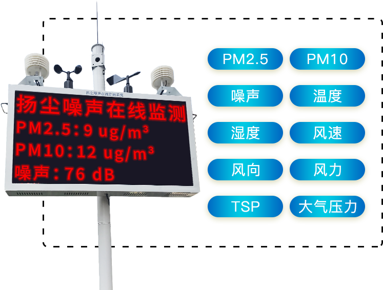扬尘噪声监测系统采用一体式设计,主要用于建筑扬尘、沙石场、堆煤场、桔杆焚烧等环境PM2.5,PM10,TSP,噪声等的实时在线监控,监测数据在户外LED屏上实时滚动显示,并可通过有线或无线网络及时传递到数据平台便于管控。