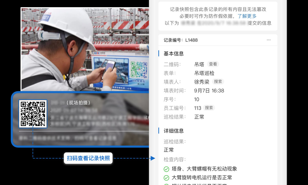 现场人员扫码填写检查记录,拍照、定位、时间戳自动绑定,替代纸质表格,数据实时汇总至平台。