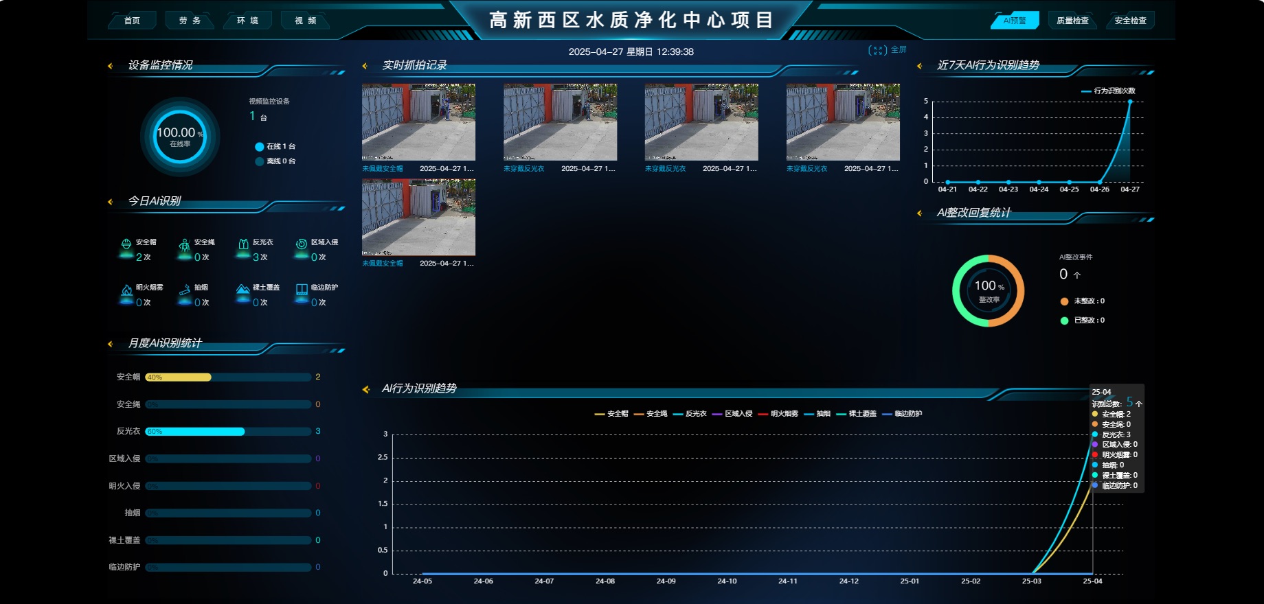 实时识别未戴安全帽、未穿反光背心、吸烟、打电话、区域入侵、攀爬临边、高空抛物、睡岗离岗等20+类违规行为,准确率≥95%。