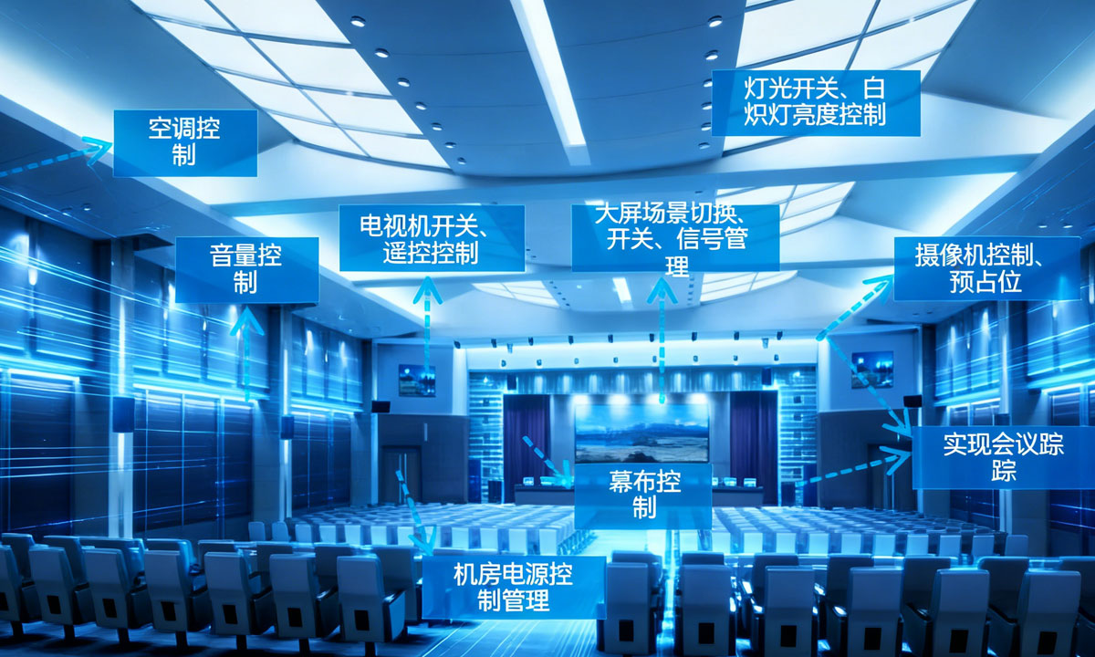 将会议室所有子系统的控制集中在触摸屏中,实现各个音响音量大小调节、音视频信息同步、投影机控制等功能。