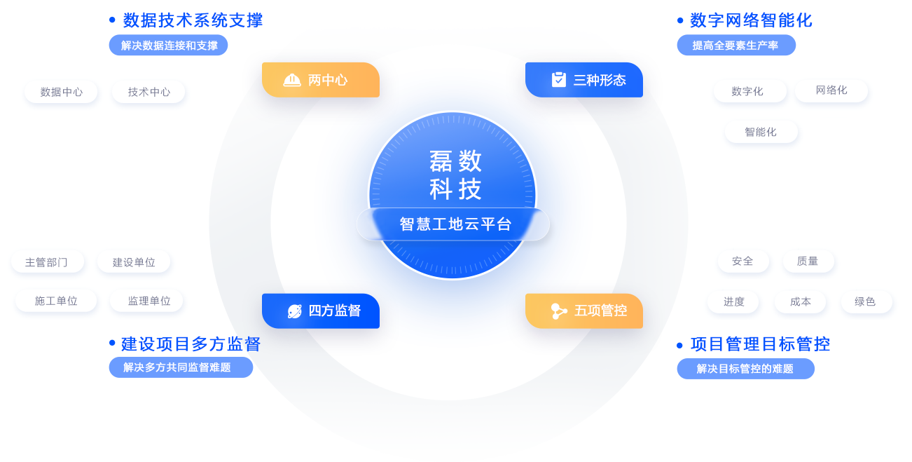 磊数科技智慧工地围绕工地现场人、机、料、法、环五大生产要素, 综合运用“BIM、AI、机器人、边缘 计算、无人机、5G、XR、区块链”等信息技术,通过数字化、网络化、智能化实现项目 全局优化, 保障工程质量、安全、进度、成本等管理目标的顺利实现,助力您的项目成为标杆。