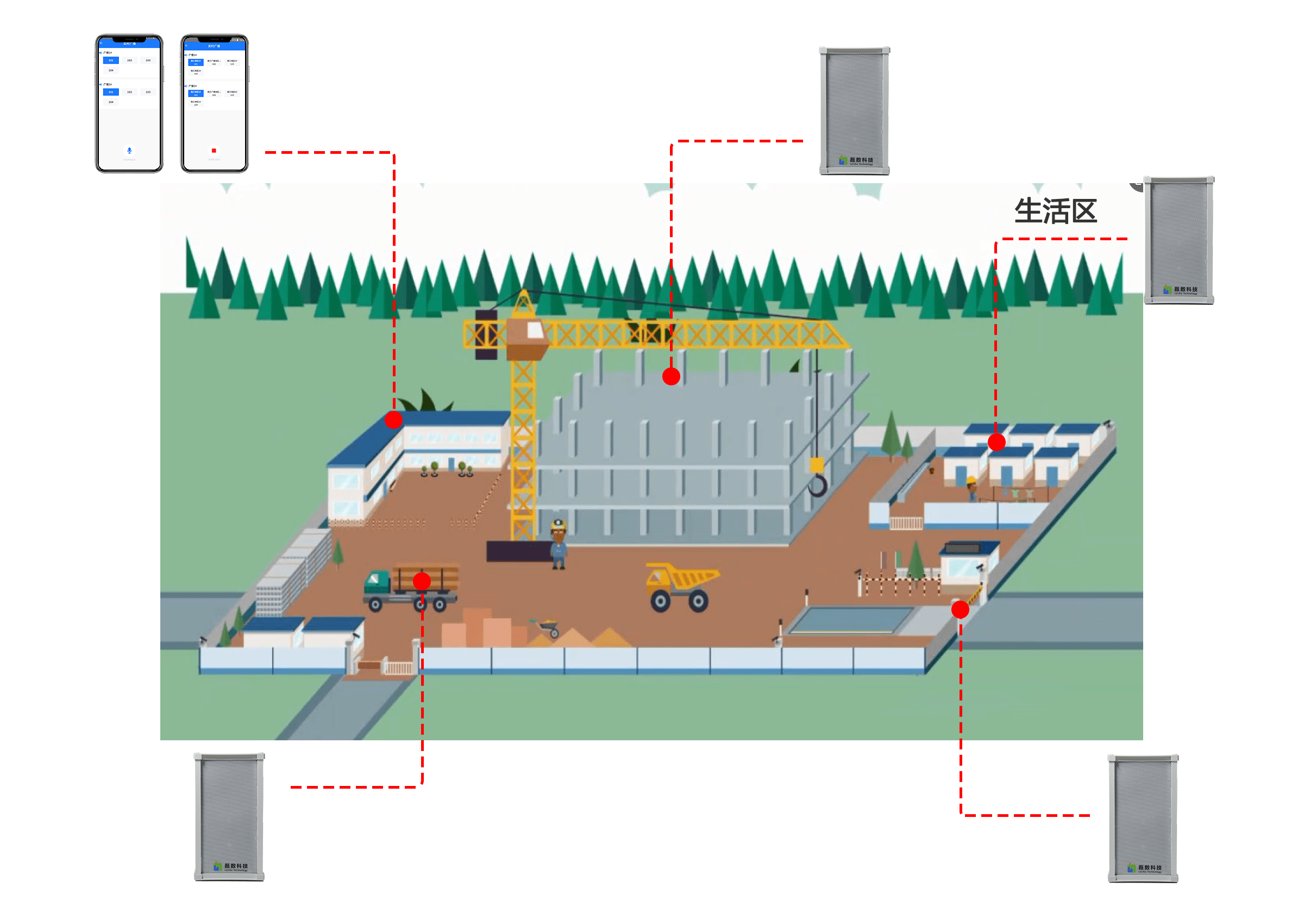 按生活区、作业区、塔吊覆盖区、出入口等划分广播分区,支持单点、分组、全区三种模式,避免"一喊全工地"。 -