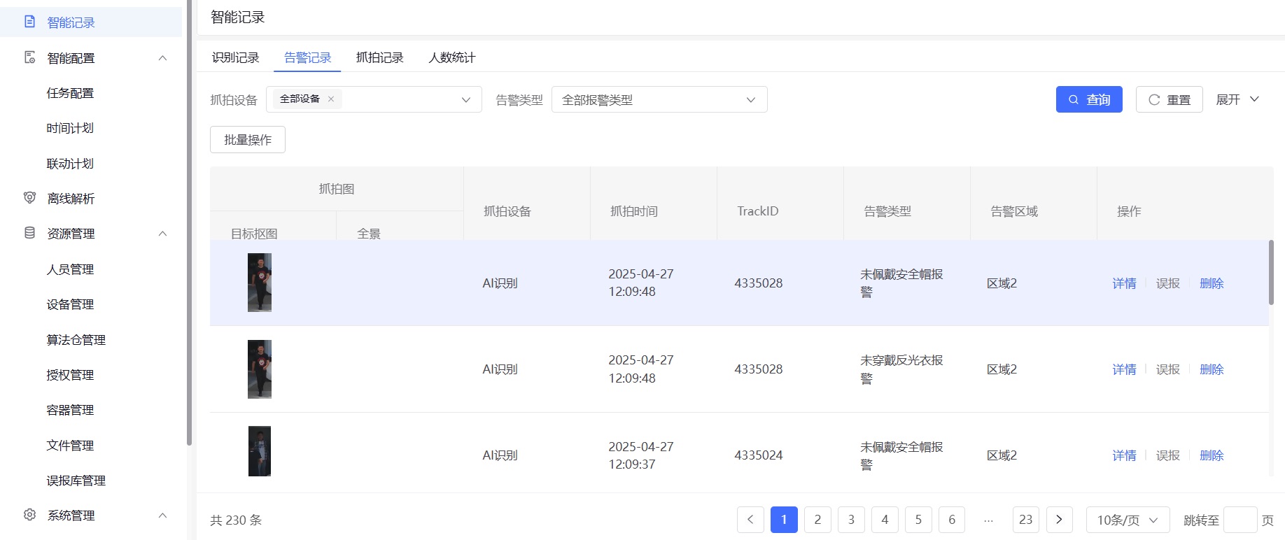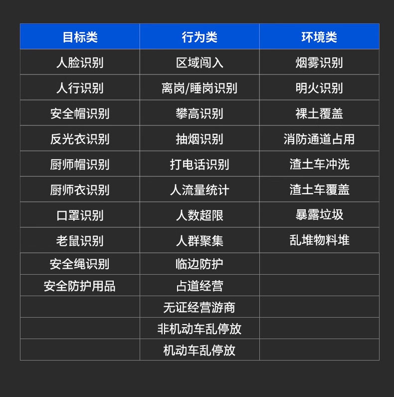 实时识别未戴安全帽、未穿反光背心、吸烟、打电话、区域入侵、攀爬临边、高空抛物、睡岗离岗等20+类违规行为,准确率≥95%。